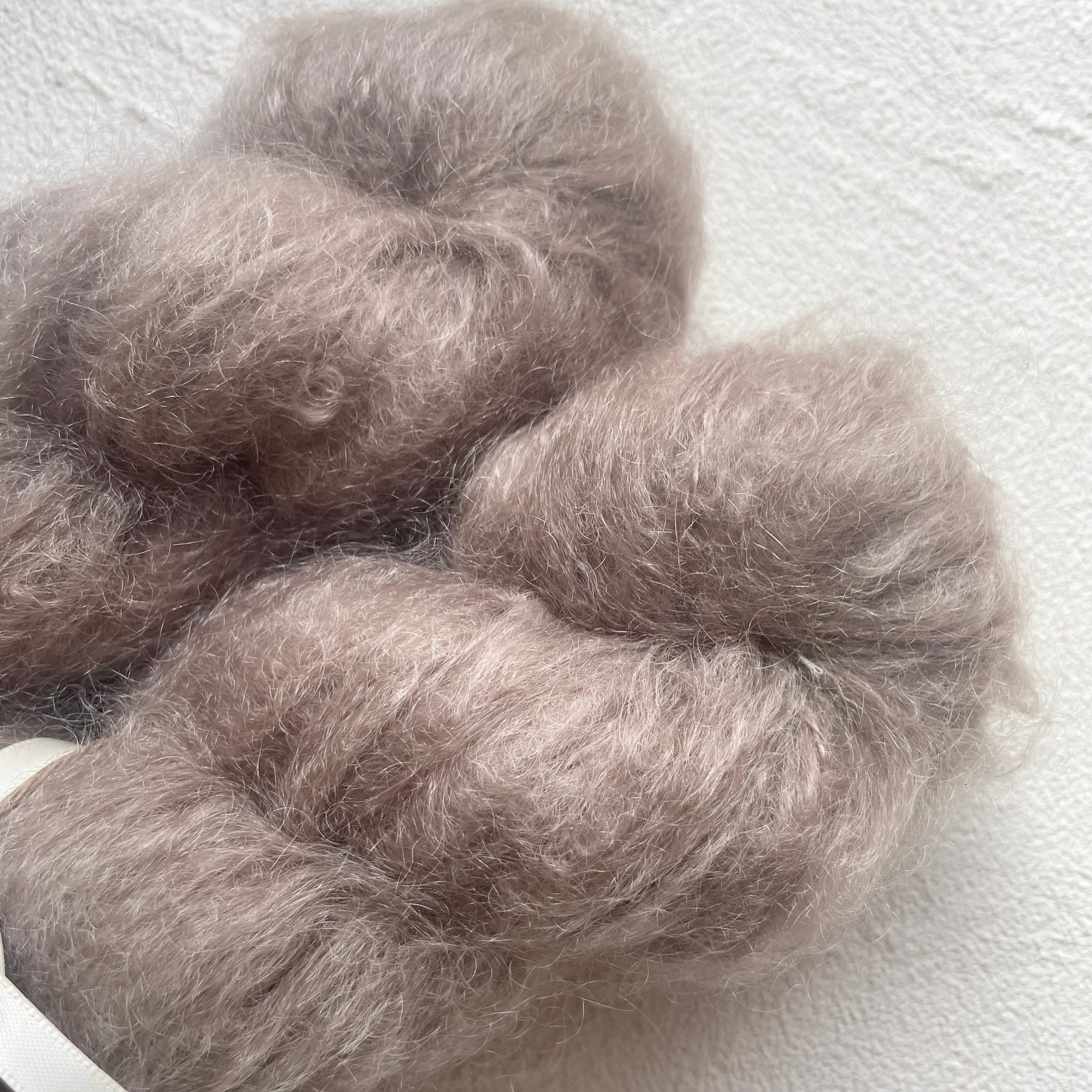 アンゴラヤギの初毛だけを選び抜いた繊維は、シルクのような光沢と、ほどよいハリ・コシを持ち、編むほどに上品な風合いを引き出します。